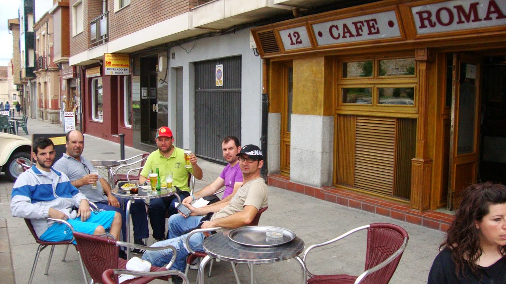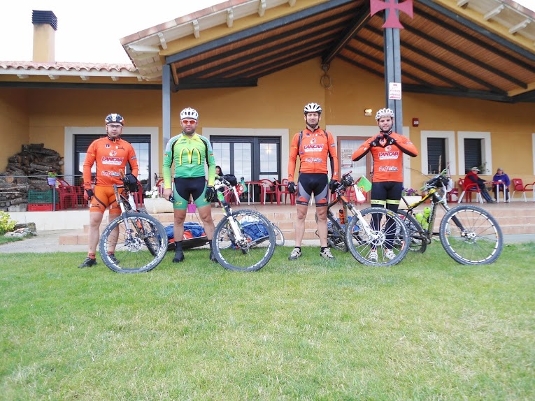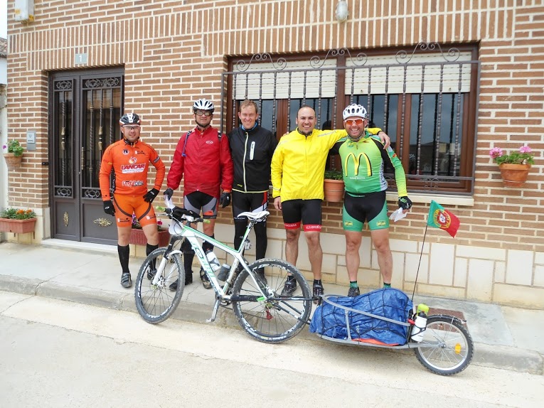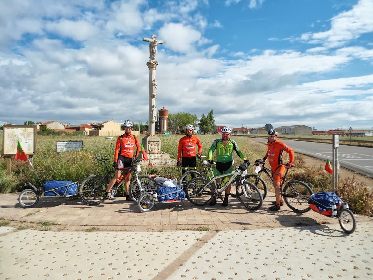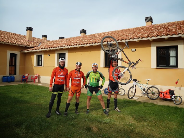 - Dia 10 de Junho, feriado em Portugal (2.ª feira): Burgos Terrenos de Templários (Sahagun). Foram 114km (menos 6 que o previsto), 807mt acumulado positivo e 9:36 a rolar. Que seca!!!! Rolar, rolar, rolar, rolar... paisagem sem nada de especial, fazer kms só porque tinham que ser feitos, um autêntico terror psicológico, com retões de mais de 5km pela frente a impôr olhares à roda da frente para evitar quebras mentais. As povoações por onde passámos parecia não morar ali ninguém. O Alentejo ao pé disto é o paraíso! Las Vegas deve ser para estes lados Para ganharmos tempo para descansar mais um pouco e garantir dormidas tivemos de parar antes do objetivo num albergue com um nome no mínimo interessante: Los Templários. Até piscina tem. Boas condições gerais. Aproveitámos para lavar roupa no tanque existente nas traseiras, que ficou a secar durante o fim de tarde e noite. Mais um dia sem net... haver, havia, mas paga-se 2€ para usar 1 de 2 pc's com ligação muito lenta e filas... O momento do dia, após um início rápido e de volta ao espírito do camino, sem chuva apesar de ameaços, foi no topo de uma serra com um acumulado de 12% durante algumas centenas de metros. Obrigado aos companheiros de momento e nossos fotógrafos, italianos de nacionalidade e peregrinos por convicção, que captaram o espírito dos nossos aventureiros: Tufo JV, Manuel João Maia, Renato Valério e Marco Lopes. Mais um dia com a barba por desfazer.Chegadados ao albergue optamos por ficar aqui e nao a 12km em SAHAGUN como previsto, a opção verificou-se acertada com optimas condições para descanso e nao so.