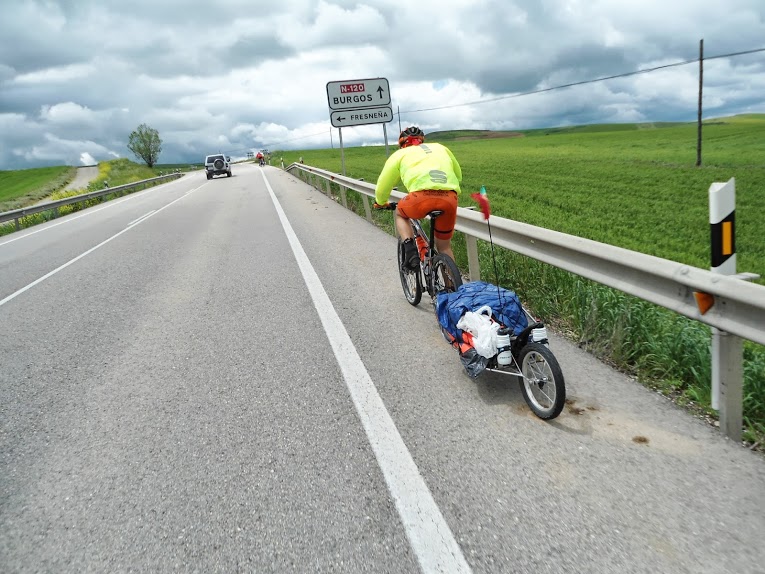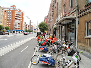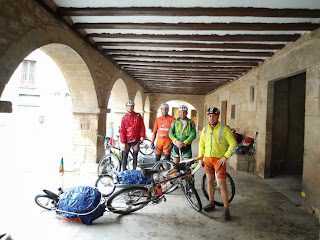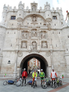 A maior tirada desta doideira, foram 133km com os trailers a reboque e a pedalar debaixo de chuva intensa e forte, bem como vento fortíssimo que nos obrigaram a optar, tal como muitos outros bicigrinos fizeram, a realizar o traçado em asfalto junto ao camino. Fizemos algumas dezenas de kms em auto via (?? - verdade!), a polícia já nem ligava, tantos eram os malucos de bicla nas faixas de emergência, momentos a não esquecer... que doideira! Hoje o Renato Valério furou a roda traseira em plena auto via mas o selante lá fez o seu papel. O Tufo JV também furou a roda traseira, mas obrigou todo o grupo a parar e a montar uma camara, isto sempre debaixo de chuva intensa, o tipo de coisa que nos leva a pensar: "Mas o que raio estou aqui aqui a fazer em pleno domingo a tantas centenas de kms de casa?" Os últimos 30km foram uma loucura, a rolar quase sempre acima dos 25km/h, puxando pelos mais de 20kg em cada trailer tirando o peso das biclas picados com um espanhol que andava a treinar na sua btt e se viu e desejou para acompanhar o nosso ritmo até à entrada de Burgos... ficou parvo quando lhe dissemos que vínhamos a puxar as carroças há mais de 130kms e ainda estávamos com aquela pica toda. Para agradecimento sacou-nos umas fotos nos melhores lugares da bonita cidade de Burgos, onde não apanhámos dormida... tivemos de voltar atrás uns 4km e lá conseguimos num camping com condições aceitáveis. Mais um dia que chegámos encharcados que nem pintos... 10:33 a pedalar com 1500 mts de acumulado positivo. O Manuel João Maia e o Marco Lopes juntaram-se ao clube dos constipados.