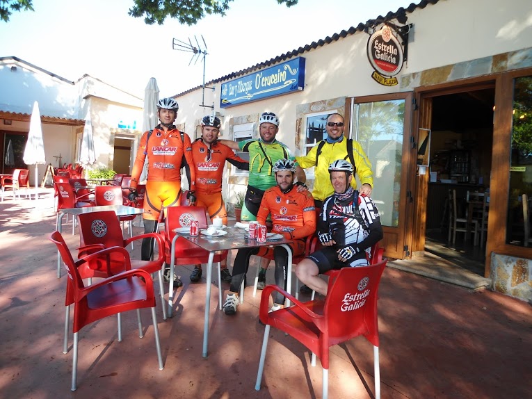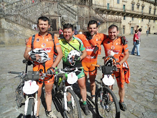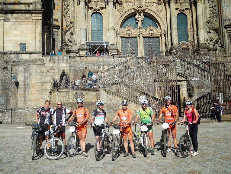 Acordamos por volta das 7h, e tomamos o pequeno almoço no albuergue, esta tirada iamos faze-la com os amigos espanhois Isi e Alfredo, uma brisa fresca de manhâ ajudou ao autentico carrosel de sobe e desce que foi esta etapa, as florestas lindissimas com tanta sombra que os raios de sol tinham dificuldade em la entrar o espirito foi sempre muito animado, paragem para almoço numa "pulperia" casa de petiscos de polvo e o Marco Lopes que foi comprar uma manete de travao da frente em segunda mão (devido a queda de ontem onde partiu a de carbono). Ritmo calmo onde o Manuel Maia e o João Valério combatiam as dores que sentiam e principalmente o ultimo sofria para nos acompanhar, fomos encontrando desta ultima etapa os grupos de conhecidos que tinhamos vindo a passar nos ultimos dias, chegamos ao Monte do Gozo (onde se avista Compostela e a partir dai é sempre a descer até la).