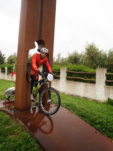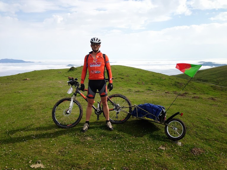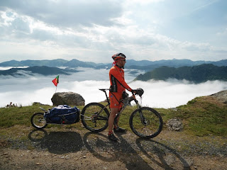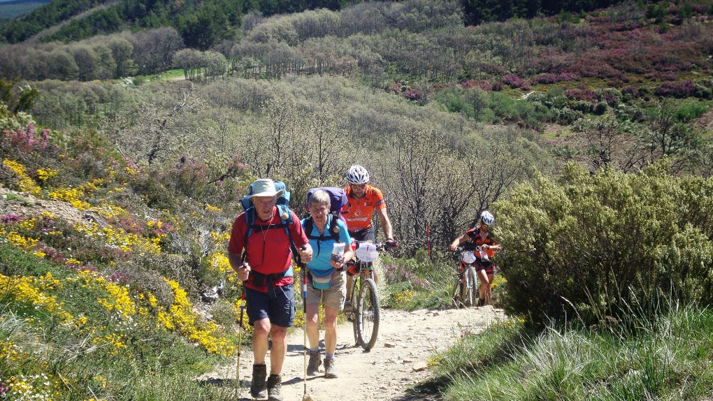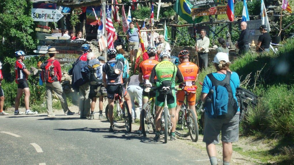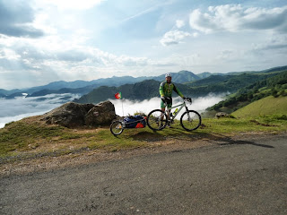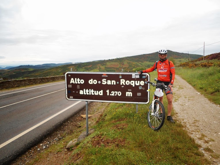 Por terra continuvamos a subir até aos 12km na maior parte dos locais as pedras humidas tornavam quase impossivel subir montado levando-nos a empurar 30kg pelos Pirineus acima,. detetou-se um problema no eixo do trailler do R.Valerio pensndo-se ser mais grave, mas resolvido com distinção ja que até ao fim nunca mais deu problemas, la continuavamos a subir com paisagens divinais, o sofrimento e esforço dava lugar a satisfação enquanto iamos passando centenas de peregrinos aquelas paisagens nunca mais as vamos esquecer.