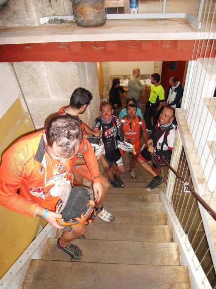 Paramos para almoçar uns bocadillos ja em Espanha e continuamos com belos bosques e descidas com muita pedra e muita turpidação la iamos fazendo os ultimos km's do dia junto a um rio onde encontravamos sempre muitos pregrinos e bicigrinos portugueses e brasileiros e alguns espanhois, a chegada a Pamplona fez-se tranquilamente e por volta das 17h10 chegavamos ao albergue que o Rafa nos tinha reservado e onde ele ja tinha chegado, mas entretanto ja tinha sido ocupado e encontrava-se esgotado, ligando para o proximo dentro de Pamplona e perto daquele local, la guardamos as bikes, os traillers e fizemos o chek in, era um antigo convento onde a disposição dos beliches mais fazia lembrar um antigo hospital as condições eram q.b. nao aconselhamos muito este local.
